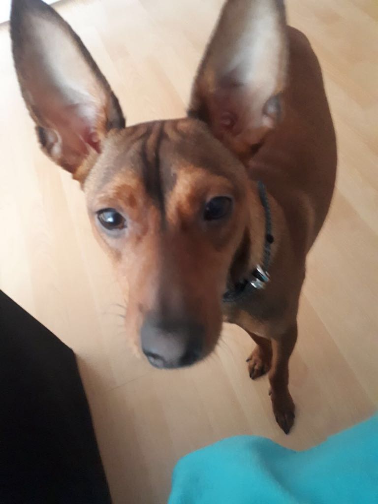 Für Liebhaber außergewöhnlicher Rassehunde muss Amigo ein wahres Goldstück sein. Es handelt sich hier nämlich um eines der seltenen Exemplare des “Pinschfledernickel”- vor langer Zeit entstanden aus der Kreuzung von Pinscher, Fledermaus und Karnickel, über die Jahre perfektioniert und heute der Inbegriff der Cuteness auf vier Pfoten.Vor gut einem Jahr traf Amigo, damals noch mit dem Namen Fresno, gemeinsam mit seinen Geschwistern bei unseren spanischen Freunden ein und sorgte mit süßen Knopfaugen und nackigem Welpenbäuchlein für ordentlich Rummel in seiner Pflegefamilie.Die 5 kleinen Hundebabys wurden eines Tages in der örtlichen Tierklinik abgegeben, kaum zwei Wochen alt und viel zu jung, um ohne fremde Hilfe und ohne ihre Mama überleben zu können. Natürlich nahmen unsere Tierärztin Montse und ihre Kollegen die hilflosen kleinen Bündel an, seufzten einmal tief, strafften die Schultern und begannen, nach einer Lösung für die 5 quietschenden Musketiere zu suchen. Zum Glück erklärte sich eine der Freiwilligen bereit, den harten “Job” als Ersatzmama für fünf hungrige Mäuler zu übernehmen und nahm die Geschwister mit nach Hause. Hundewaisen aufzuziehen bedeutet, sie alle paar Stunden zu füttern (ja, auch nachts!), die dadurch entstehenden Hinterlassenschaften entfernen, ganz viel kuscheln und schmusen, um die fehlende Mama ein Stück weit zu ersetzen, ja, und dann bedeutet es aber auch: voller Stolz und Freude beobachten, wie die hilflosen Würstchen immer selbständiger werden, neugierig ihre Umgebung erkunden, auf tapsigen Pfoten die ersten waghalsigen Sprünge wagen und dabei feststellen, dass die kleinen Näschen auch zum Bremsen ganz prima geeignet sind. Leider erkrankten alle Welpen an Staupe und zwei der Geschwister überlebten diese heimtückische Infektion nicht. Amigo schaffte es jedoch, sprang dem Tod in einem für ihn typischen Riesensatz von der Schippe und reiste im Mai 2017 zu seiner Familie nach Deutschland. Leider war Amigos Glück nicht von Dauer. Nach ungefähr einem Jahr wurde der kleine Kerl abgegeben, da er (typisch Pubertätslümmel) seine Grenzen testete und sich ein paar Unarten angeeignet hatte. Nun, wenn ein Mensch- Hund- Gespann trotz Bemühungen nicht zusammenpassen mag, können wir nur handeln und haben zum Glück äußerst liebevolle, fähige und spontan hilfsbereite Pflegestellen- wie auch in Amigos Fall.Seit April 2018 lebt unser ca. einjähriger Jungspund nun gemeinsam mit Hundekumpels und Kindern, trifft sich regelmäßig mit Katzen, Pferden und anderen Vierbeinern und kommt mit allen prima aus. Unser Schönling mit den Riesenohren hatte in seinem ersten Lebensjahr nicht die Gelegenheit, allzu viel zu lernen, doch das Tempo, das er nun vorlegt, wenn es darum geht, neue Dinge zu verinnerlichen, beeindruckt sowohl seine Pflegefamilie als auch jeden, der den kleinen Feger kennenlernt. So unruhig und aufgeregt Amigo oft ist, wenn ein neuer Reiz ihn zunächst überfordert, so gerne und willig lässt er sich mit ganz viel Ruhe dazu bringen, sich auf seine Aufgabe zu konzentrieren. Selbstverständlich ist unser übereifriges “Cleverle” stubenrein und kennt die Regeln im Haus, er begleitet gemeinsam mit seinem Hundekumpel sein Pflegefrauchen zur Arbeit und hat bereits begriffen, dass man sich in dieser Zeit am besten ausruht, er zeigt bisher keinen Jagdtrieb und möchte mit allem und jedem gut Freund sein. Dominanteren Hunden gegenüber wird er schnell unsicher, versucht, seine Angst hinter einer pinschertypisch “großen Schnauze” zu verstecken, merkt jedoch schnell, dass er angesichts seiner Größe niemandem wirklich Respekt einflößt und beschwichtigt dann lieber- typisch für einen Hund an der Grenze zum Erwachsenwerden, der die nötige Souveränität in allen Lebenslagen erst noch erlernen muss. Alleine zu bleiben war anfangs schwierig für den lustigen und sehr anhänglichen Flummy- innerhalb von nur zwei Wochen hat Amigo jedoch bereits begriffen, dass es vollkommen in Ordnung ist, in dieser Zeit Energie für neue Abenteuer zu sammeln. Was unser kleiner Intelligenzbolzen unbedingt braucht, sind feste Bezugspersonen und ein ganz klar strukturierter Tagesablauf. Vielleicht handelt es sich bei ihm um eine sehr spezielle Persönlichkeit, ähnlich dem Protagonisten der Serie “Monk” (wobei Amigos Eigenarten sicherlich weniger unangenehm für sein Umfeld sind), doch es ist schon so, dass Unruhe sich leicht auf ihn überträgt. Ein souveräner Ersthund ist zwar keine Voraussetzung für eine Vermittlung, würde dem freundlichen Pubertier jedoch die Eingewöhnung sehr erleichtern. Hundeerfahrung und eine gesunde Balance aus Nachsicht und Konsequenz sind die Eigenschaften, die auf der zweibeinigen Seite für ein harmonisches Miteinander mit diesem kleinen Goldschatz sorgen. Apropos Goldschatz: Amigo ist ein ganz, ganz großes Kuschelmonster und genießt körperliche Nähe in vollen Zügen- es ist eben doch ein weiter Weg zum Erwachsensein…Wir sind uns sicher: Amigo wird, in fähigen Händen, zu allen Schandtaten bereit, pardon, für jede Karriere offen sein. Egal, ob auf dem Agilityplatz, beim Hundesport oder anderen Aktivitäten, bei denen es auf besonders viel Grips und Schnelligkeit ankommt- diese kleine Sportskanone wird alle Umstehenden vor Neid erblassen lassen und, wenn es sein muss, mit seinem Menschen durchs Feuer gehen. Worauf warten Sie denn noch?