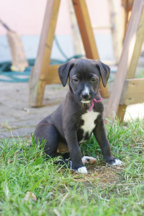 Im April 2016 durfte unsere kleine Siri, damals noch Sandy, in ihr neues Zuhause einziehen. Alle waren glücklich, dass die kleine Bodeguera eine liebevolle Familie gefunden hatte, die uns regelmäßig Updates schickte und uns darüber informierte, dass mit der kleinen Hündin alles in Ordnung sei. Siri befand sich zum Zeitpunkt des Transports in ihrer ersten Läufigkeit und sollte danach kastriert werden- was jedoch wohl niemand mitbekommen hatte: die kleine Maus hatte in Spanien wohl bereits einen adretten Hundemann kennen gelernt, sich in diesen verliebt und genau diese Liebe hatte Früchte getragen. Siri war bereits trächtig! So etwas ist natürlich ein Schock für jeden Tierschutzverein und ganz besonders für die neue Familie, die sich die erste Zeit mit dem neuen Familienmitglied sicher ganz anders vorgestellt hatte- doch Siris Familie hielt zu ihr und sie brachte im Juni ihre kerngesunden Welpen zur Welt. Wir haben keine Ahnung, welche Gene der Papa der Welpen in sich trägt, aber die 5 Racker sind dermaßen zum Knuddeln, dass ihre Abstammung total in den Hintergrund rückt. Den größten Einfluss hat sowieso die Mama und deren Erziehung, und da haben diese Hundekinder definitiv das große Los gezogen. Siri hat von Anfang an verstanden, was sie mit diesen kleinen, hilflosen Fellbündeln machen muss, sie sie trocken geleckt und ihre Bäuche massiert und hat ihre eigenen Bedürfnisse völlig in den Hintergrund gestellt. Nun wird es aber langsam Zeit, den kleinen, tapsigen Welpen Lebewohl zu sagen und für jeden eine eigene Familie zu finden, damit sie sich alle auf ihre eigene Art und Weise entwickeln und zu glücklichen Hunden werden können.Berta, die wie ihre Schwester Nala in klassischem Schwarz mit hübschen weißen Applikationen überzeugt, ist die größte Schmuserin unter den Geschwistern. Wann immer Herrchen oder Frauchen bereit für Streicheleinheiten sind, steht Berta parat und drückt ihren kleinen Körper so dicht es nur geht an die warmen Zweibeiner. Die kleine Prinzessin hat aber noch eine andere Seite, sie ist nämlich auch eine ganz vorwitzige und neugierige Vertreterin, die ihren Geschwistern stets voraus läuft und fremde Dinge und Spielsachen immer als Erste entdeckt.Die kleine Berta sucht nun also eine humorvolle Familie, die gemeinsam mit dem kleinen Frechdachs die Welt erkundet und sich darauf freut, das niedliche Hundekind aufwachsen und sich zu einer stolzen Hundedame entwickeln zu sehen. Wir sind uns sicher- der Spaßfaktor ist mit diesem kleinen Sonnenschein garantiert!