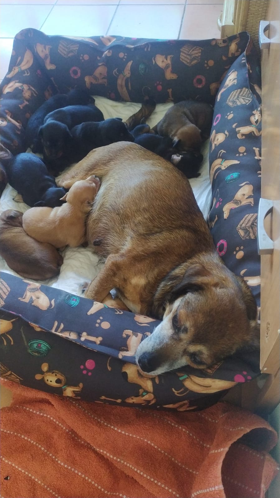 Im März 2023 erreichte die Tierschützer von Dolmen Animal ein Hilferuf. Eine Hündin, die schon vor längerer Zeit von ihren Besitzern auf die Straße verfrachtet worden war, sei augenscheinlich hochträchtig. Natürlich zögerten unsere Partner nicht, Bimba – so heißt die liebevolle Mamacita – in ihre Obhut zu nehmen. Die lustige Mischlingsdame (Bimba erinnert an eine Kreuzung zwischen Dackel und Kartoffel; und stellen Sie sich das bitte noch tragend vor!) kam also bei Dolmen Animal unter und bescherte unseren Freunden in Andalusien nach sechs Tagen im Tierheim den Cuteness Overload des Monats. Acht gesunde Welpen tummelten sich am Bauch ihrer Mama, und offensichtlich hatte bei deren Entstehung ein Pinscher die Pfoten im Spiel.