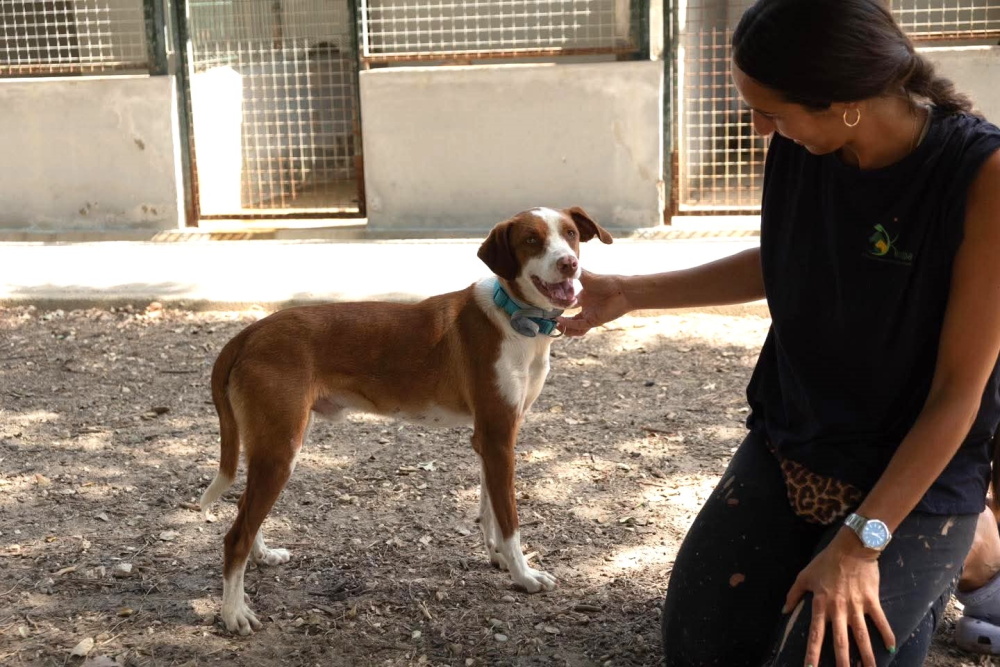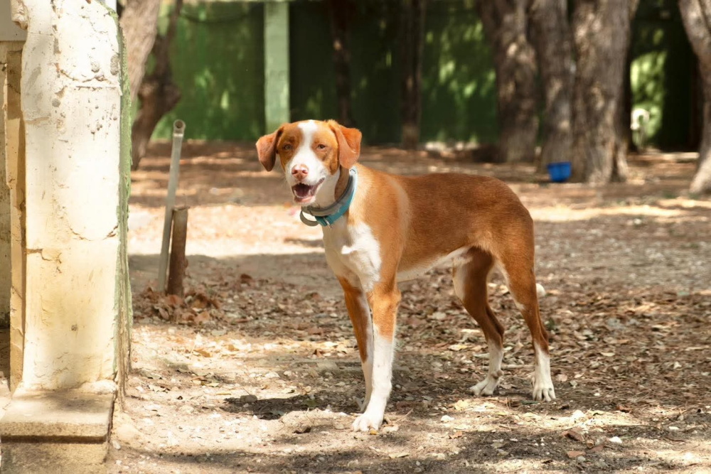 Blas ist zweieinhalb Jahre alt (Stand 10/2025) und ein bildhübscher junger Mann mit großen Ambitionen. Der wundervolle rot-weiße Charmeur hatte noch nie ein echtes Zuhause. Ob er auf der Straße geboren wurde oder, wie so viele seiner Artgenossen, von einem Jäger entsorgt wurde, wissen wir nicht, aber Blas hatte jedes Vertrauen in die Menschheit verloren. Er irrte wochenlang durch ein Gebiet mit mehreren vielbefahrenen Straßen, und tierliebe Anwohner fürchteten jeden Tag um das Leben des ängstlichen Rüden. Blas kam jede Nacht und holte sich das angebotene Futter, aber er fiel auf keine noch so clevere Falle herein, und auch die eingeschalteten Tierschützer des Refugio Kimba brauchten mehrere Tage, bis sie den schlauen Weltenbummler endlich sichern konnten.