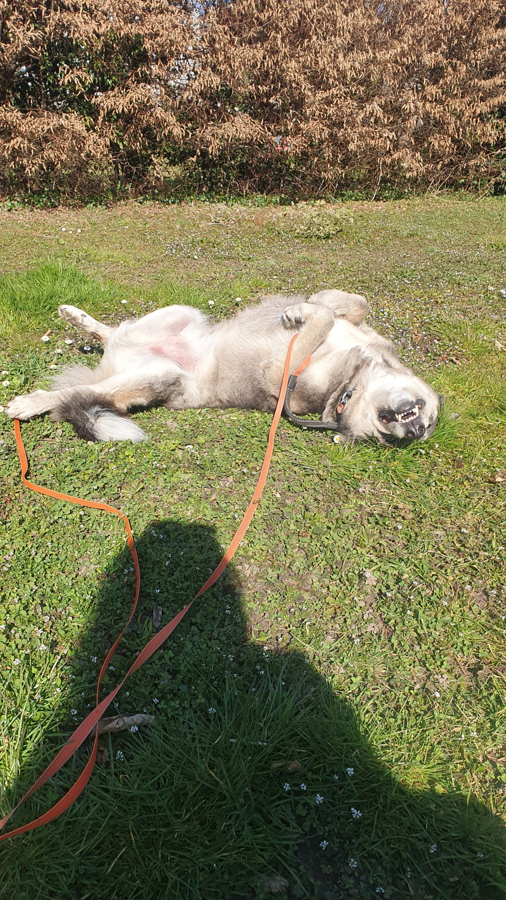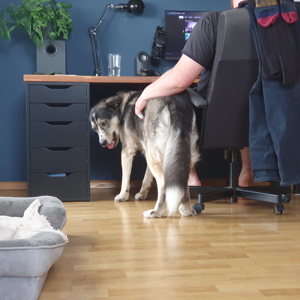 Man weiß nicht viel über Codys Vorgeschichte im Ausland, aber obwohl er mit seinen eigenen Menschen sehr vertrauensvoll agiert, selbst mit Besuchern hingebungsvoll kuschelt und ein Liebling der ganzen Nachbarschaft ist, hat er nach wie vor mit großen Ängsten zu kämpfen. Cody ist sehr geräuschempfindlich und reagiert auf Stress mit Übersprungshandlungen. Es wurde eine Schilddrüsenüberfunktion festgestellt, die mittlerweile gut eingestellt ist, aber auch das machte ihn in für ihn angespannten Situationen nicht viel gelassener. Ein Verhaltenstierarzt hat ihm nun zusätzlich Medikamente verordnet, die ihm helfen, ruhiger zu bleiben und Stresssituationen ausgeglichener durchzustehen. Das entlastet Cody ebenso wie seine Familie, ist aber natürlich nur eine Therapie der Symptome, nicht des Grundproblems …