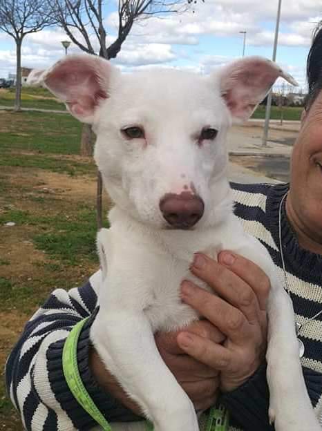 Copito ist eine geniale Schneeflocke, ein Mischling, der zu mindestens 90% aus Podenco Andaluz Maneto (der kurzbeinigen Variante des Podenco) besteht, aber mit seiner weißen Farbe eben die absolute Ausnahme darstellt. Copito ist also ein echter Hingucker und ein lustiger Clown obendrein.