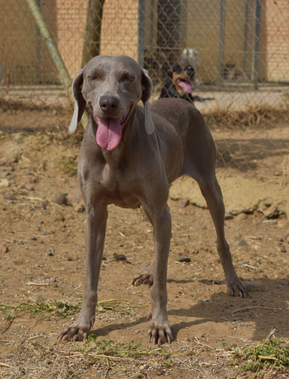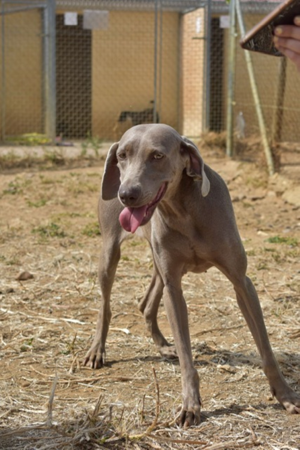 Üblicherweise landen ausrangierte Jagdhunde hauptsächlich in Form von Galgos und Podencos in allen Farben, Altersklassen und Zuständen bei unseren spanischen Partnern. Dass sich Rassehunde wie Diana hierher “verirren” ist äußerst selten, da sich diese Hunde bei entsprechender Eignung auch recht gut weiterverkaufen lassen. Wir wissen natürlich nicht, aus welchem Grund Dianas Besitzer die Hündin stattdessen im Tierheim abgab, wir können nur mutmaßen, dass eben diese jagdliche Eignung der Knackpunkt war… Diana ist nämlich eine äußerst ruhige Dame und es liegt der Verdacht nahe, dass sie schlicht und einfach nicht zur Jagd taugte. Dies soll nun kein Freifahrtschein für Interessenten sein, zu glauben, sie hätte kein Interesse an Wild- ein Weimaraner ist und bleibt ein Jagdhund- doch das bildhübsche Mädchen ist viel mehr an Menschen und deren Händen interessiert als an Bällen oder sonstigem beweglichen Spielzeug. Die ca. dreieinhalbjährige Lady (Stand Juni 2024) lebt zwar erst seit kurzem in der Arca Sevilla, doch sie zeigt bereits, dass sie in ihrem vorherigen Leben auf Streicheleinheiten weitgehend verzichten musste und dieses Defizit unbedingt nachholen will. Anhänglich folgt sie den Pflegern, immer in der Hoffnung auf ein liebes Wort, ein Tätscheln oder gar eine ausgiebige Streicheleinheit, für die im stressigen Tierheimalltag immer zu wenig Zeit ist.