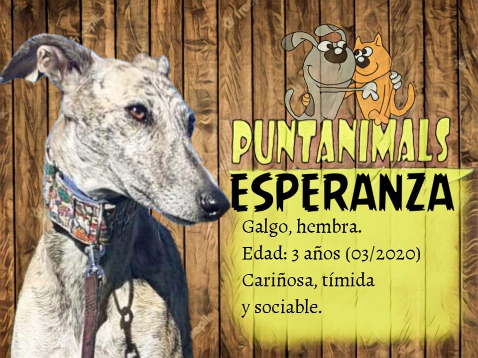 Esperanza kommt von einem Galguero, einem Jäger, der seine unzähligen Hunde für die Hetzjagd einsetzt. Da diese Art des Zeitvertreibs als schützenswerte Tradition vom Tierschutzgesetz in Spanien ausgeschlossen wird, können die Galgueros weiter ihre Rudel in dunklen Scheunen anketten, wo die Hunde zur besseren Kontrolle so kurzgehalten werden, dass sie sich auch zum Schlafen nicht hinlegen können. Sie können weiter beliebig aussortierte Hunde erschießen, die Beine der Vierbeiner brechen, sie in den Bergen zum Sterben aussetzen, sie in den Bäumen aufhängen, um sie langsam ersticken zu lassen. Wir möchten uns also alle gar nicht vorstellen, was passiert sein muss, dass die örtliche Polizei einem dieser Menschen die Tiere wegen schlechter Haltung entzieht – doch Esperanza ist genau das passiert.