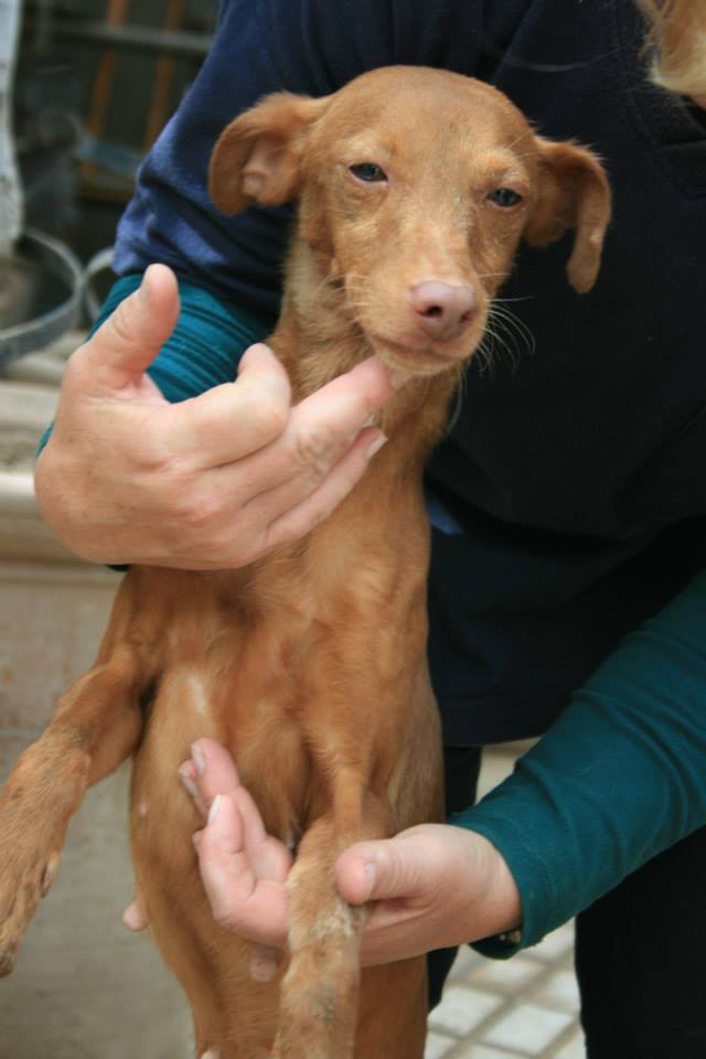 Auch Fee gehört zu der Gruppe der geretteten Vierbeiner. Zarte kleine Podenca, die sie ist, hätte man eigentlich erwartet, dass sie nach solch einer schrecklichen Erfahrung ängstlich reagiert, doch Fee begrüßte die Tierschützer wie lang erwarteten Besuch und zeigt sich auch jetzt in der Pension als fröhliches, aufgewecktes Wesen. Sie liebt es zu spielen und zu toben, mit Freunden zu balgen und sich auf den Rücken zu schmeißen, um sich den Bauch streicheln zu lassen.