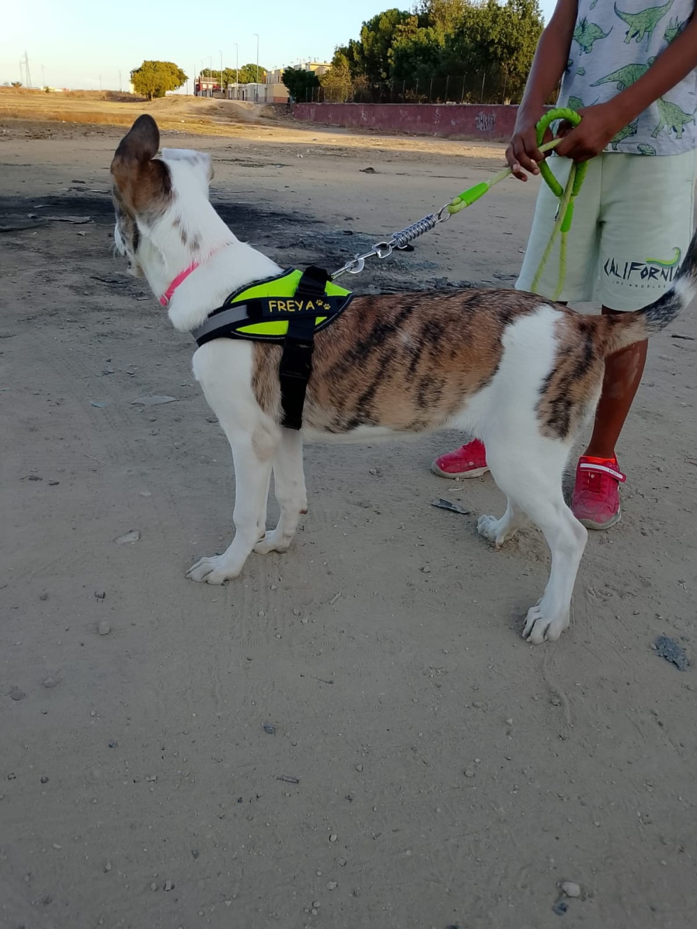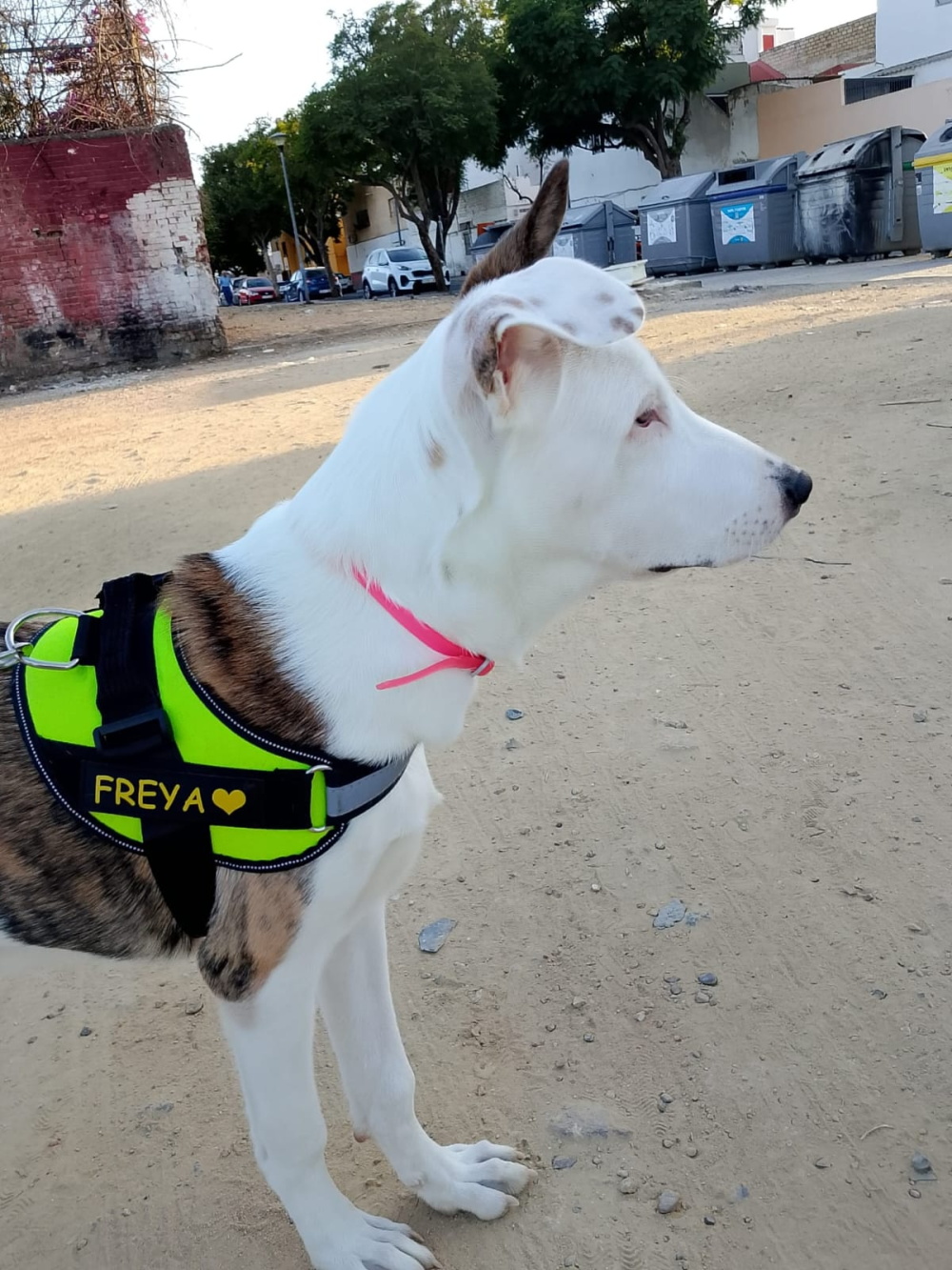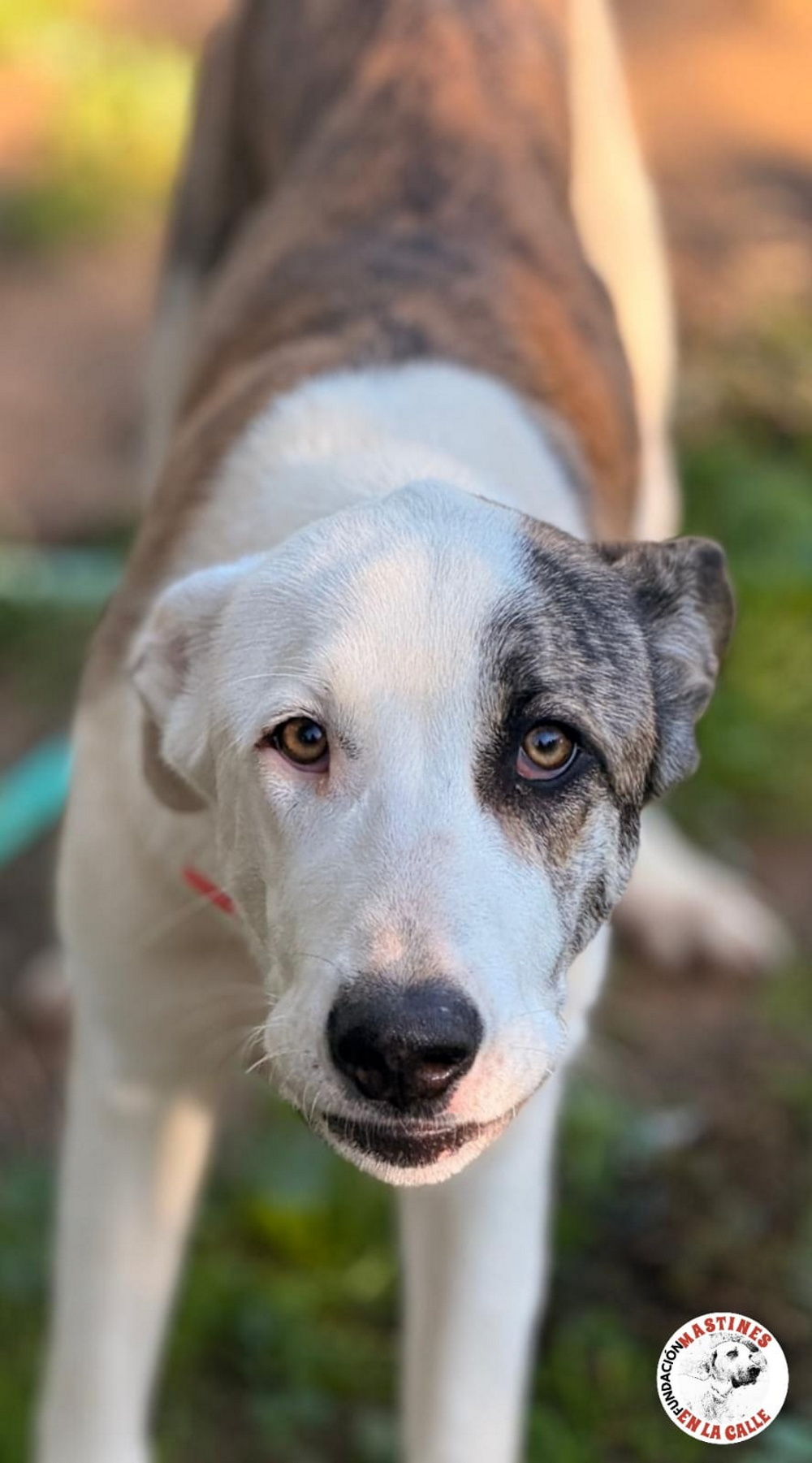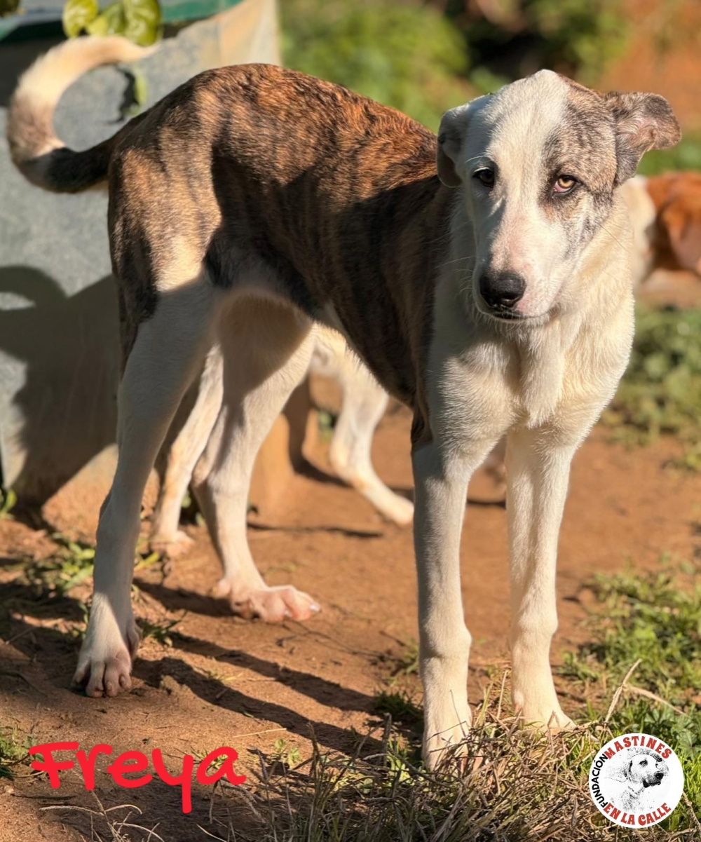 Freya ist eine große, elegante Hündin (ca. 70 cm) mit Windhund-Charme – und sehr wahrscheinlich mit einem Schuss Herdenschutzhund in den Genen. Sie kam vor einigen Monaten in die Obhut von „Mastines en la calle“, nachdem sie verlassen aufgefunden wurde. Heute zeigt die knapp einjährige (Stand 04/2026) Schönheit, wie aus abgelehnten Hunden die wundervollsten Fotomodelle und (noch viel wichtiger) Knutschkugeln werden.