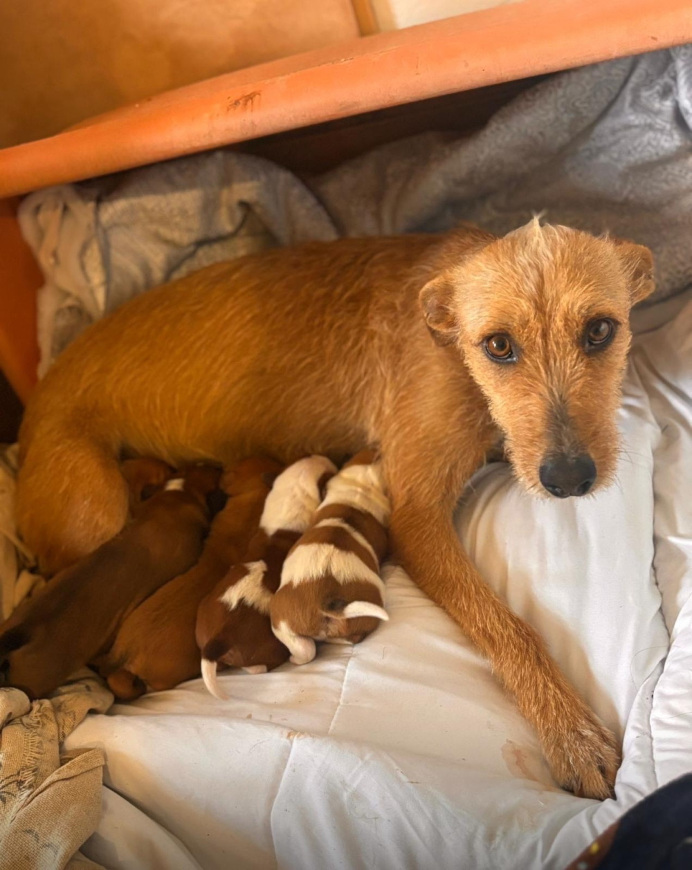 Im November befreiten unsere Freunde von der Arca Sevilla eine Hündin, auf die die Tierschützer schon länger aufmerksam geworden waren. Fehlende und zu lasche Gesetze verhinderten über Monate, dass der wundervollen und sehr lieben Hundedame geholfen werden konnte. Sie verbrachte ihr ganzes bisheriges Leben angebunden auf einem Feld, und hatte einen Wurf nach dem anderen, geboren in den Exkrementen ihrer unterernährten Mama. Im Winter 2024 konnten die Tierschützer nicht mehr länger zuschauen, und das schon wieder hochträchtige Mädchen zog zu einer erfahrenen Pflegefamilie. Schon wenige Tage darauf, am 1.12.2024, kamen die Welpen auf die Welt. Dank guten Futters und der längst überfälligen Pflege durch einen Tierarzt, weiche Kissen und viel Liebe erblickten alle Babys gesund das Licht der Welt. Einige der kleinen Racker sind schon zu eigenen Familien gezogen und begeistern ihre Halter, die dankbare und fröhliche Mama hat sich so toll entwickelt, dass aus ihren Pflegeeltern strahlende Adoptanten geworden sind – aber zwei der kleinen Nachwuchsforscher haben noch kein Zuhause gefunden.