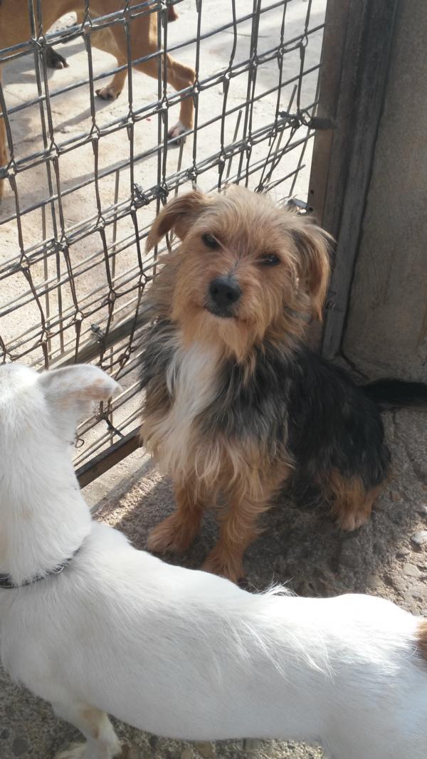 Kenzo ist einer unserer lustigen Terriermischlinge (vermutlich mit einem guten Schuss Yorkshire und Fox). Der witzige, erst zwei Jahre alte (Stand 01/2016) Clown wurde auf dem Friedhof nahe des Tierheims von Gärtnern entdeckt. Freundlich und kontaktwillig bettelte der kleine Charmeur mit dem großen Herzen und dem breiten Grinsen um ein bisschen Frühstücksbrot, bot im Tausch für ein Stück Apfel einen feuchten Kuss an und unterhielt die Arbeiter mit Versuchen, sich selbst an der Brotzeit zu bedienen. Aus seiner menschenzugewandten Art, seinem Vertrauen und der Selbstverständlichkeit mit der Kenzo agierte, schlossen die Gärtner, dass er wohl schon gute Erfahrungen mit Leuten gemacht haben müsse – und diese These führte zu der Annahme, dass er bestimmt aus der nahegelegenen ArcoNatura weggelaufen sei. Also brachte man den süßen Wuschel auch genau dahin zurück, allerdings vermisste man ihn dort nicht. Selbstverständlich kam Kenzo aber trotzdem unter und genießt jetzt schon seit einigen Monaten die Gastfreundschaft unserer andalusischen Partner.