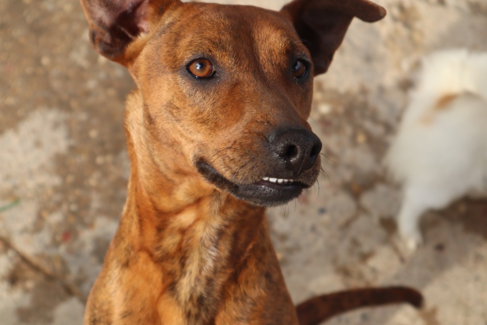Unsere kleine gestromte Schönheit fiel Anfang September einem Tankstellenbesitzer auf. Jeden Tag kam die erst zwei Jahre alte (Stand 10/2018) Hündin zu den Mülleimern, wusste genau, dass die Ausbeute besser würde, wenn sie wartete, bis Reisebusse auf dem Rastplatz waren, und jeden Tag zitterte der tierliebe Mann, ob die Streunerin wieder verletzungsfrei über die Autobahn verschwinden würde. Die ArcoNatura hatte der Tierfreund schon informiert, aber unsere Partner hatten einen langen Anfahrtsweg, der während eines Tages mit Arbeit und den zusätzlichen Aufgaben im Tierheim nicht zu bewältigen war. So konnte man nur hoffen, dass Maya bis zum kommenden Wochenende überleben würde – und keiner ahnte, dass noch andere Leben betroffen waren.Als die Tierschützer am Sonntag nach der Hündin suchten, erfuhren sie, dass sie nicht aufgetaucht sei, dass sie sich schon einen Tag zuvor seltsam verhalten habe – und weil man nichts Besseres tun konnte, machte man sich gemeinsam mit dem Tankstellenwart auf die Suche. Und man fand Maya. Sie lag in einer Erdkuhle, umgeben von toten Welpen, die in der prallen Sonne einfach an Dehydrierung gestorben waren. Maya hatte nicht genug Kraft und Milch, sich um ihre Babys zu kümmern. Sofort fuhr man mit Maya in die Tierklinik, wo unsere Tierärztin feststellte, dass Maya die Geburt nicht beendet hatte, ein toter Welpe war noch in ihrer Gebärmutter geblieben und vergiftete die Mutter. Es folgte eine Notoperation, die Maya aber zur großen Freude ihrer Retter sehr gut verkraftete.Jetzt wohnt Maya im Tierheim der ArcoNatura und hat sich bestens erholt. Sie hat schnell Kontakt mit den anderen Hunden bekommen und zeigt sich neugierig und anhänglich, wenn unsere Partner in die Einrichtung kommen. Maya ist offen und kontaktfreudig, und mit gerade mal 35cm Schulterhöhe hat sie auch eine sehr angenehme Größe. Ihre Farbe ist außergewöhnlich und die Stromung ihres Fells ist wahrlich ein Hingucker.