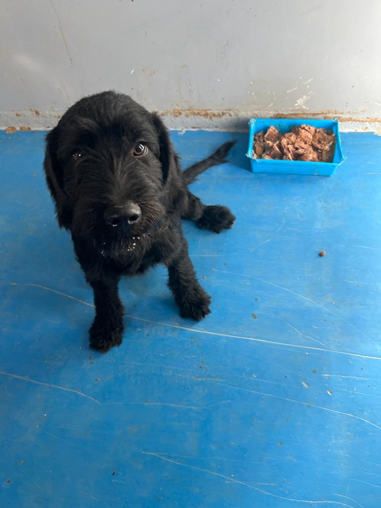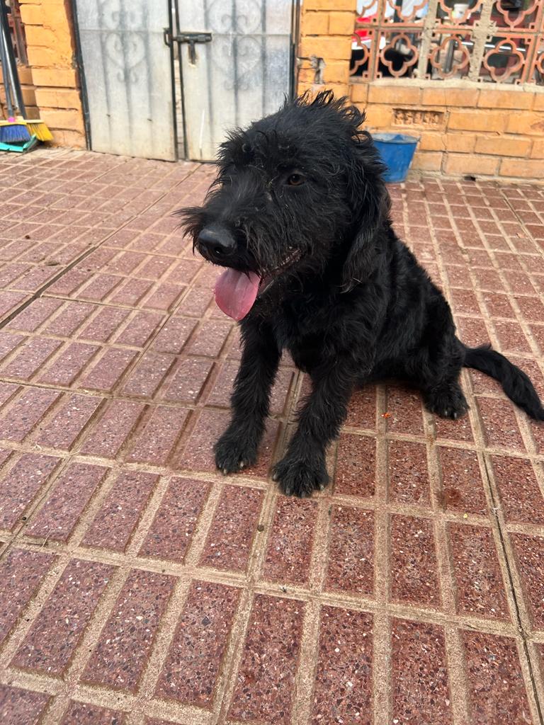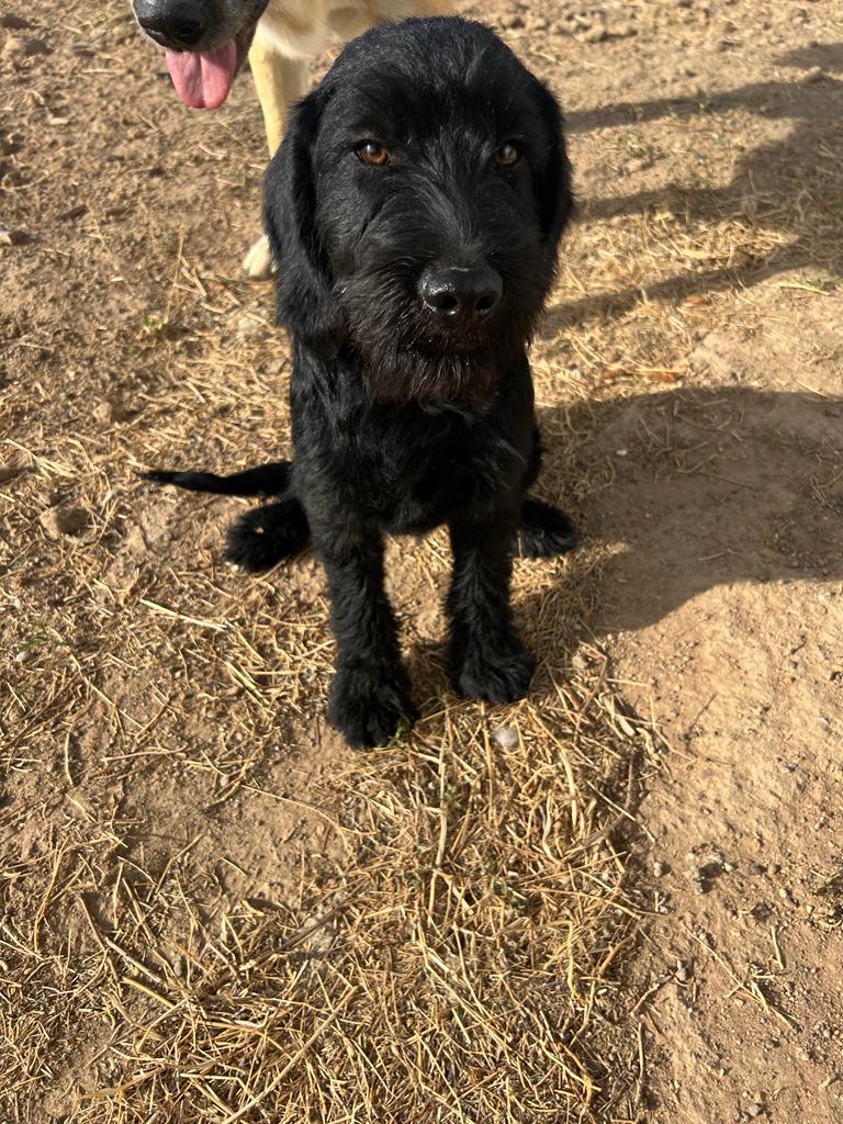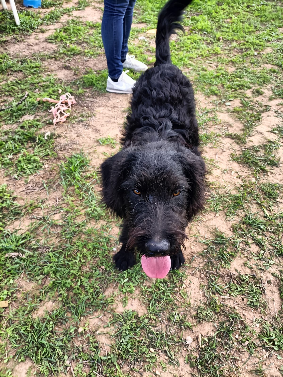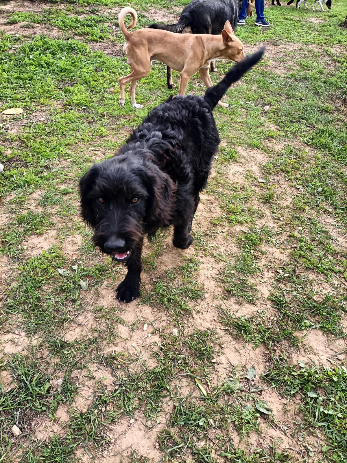 Unser kleines Kohlestückchen Orson marschierte im August 2022 auf eine Finca in der Nähe von Huelva und fragte dort bestechend höflich nach Essen, Wasser und Zuneigung. Zu dieser Zeit war der lustige Lockenkopf gerade 8 Wochen alt und die Besitzer der Finca waren sicher, dass bald jemand nach Orson fragen würde. Aber niemand kam, keine Mutter, keine verzweifelten Halter, keine Geschwister – und so informierten die Tierfreunde unsere Partner von Dolmen Animal.