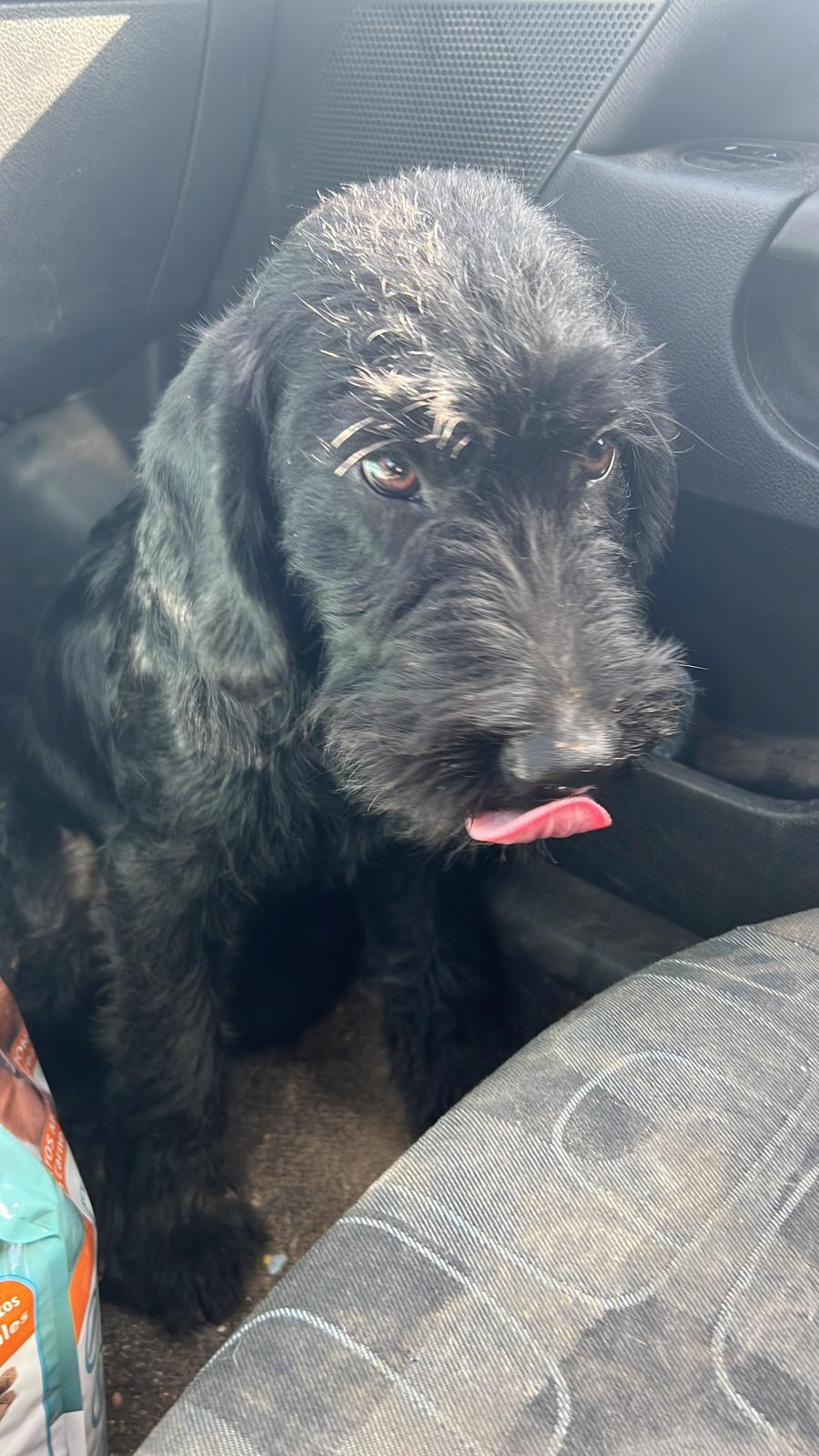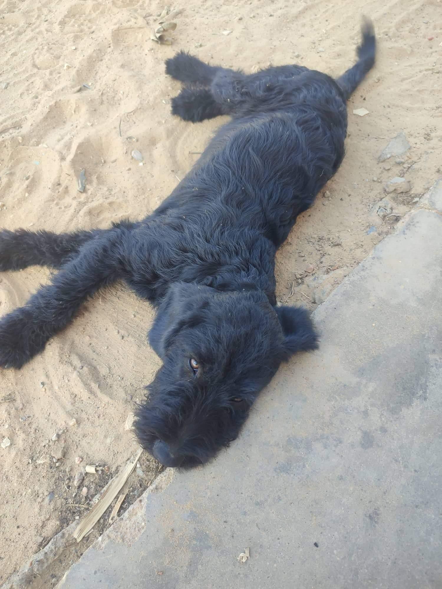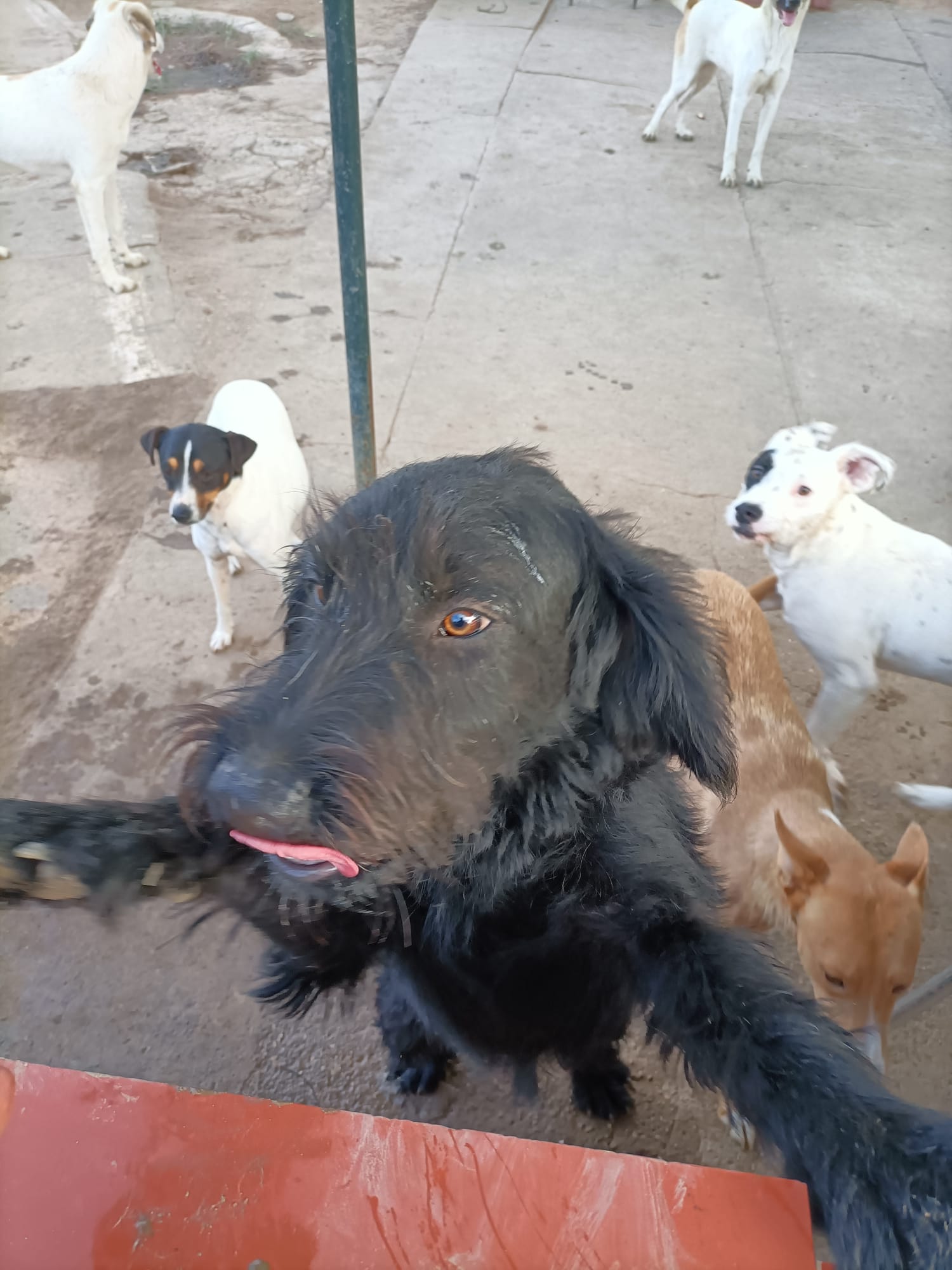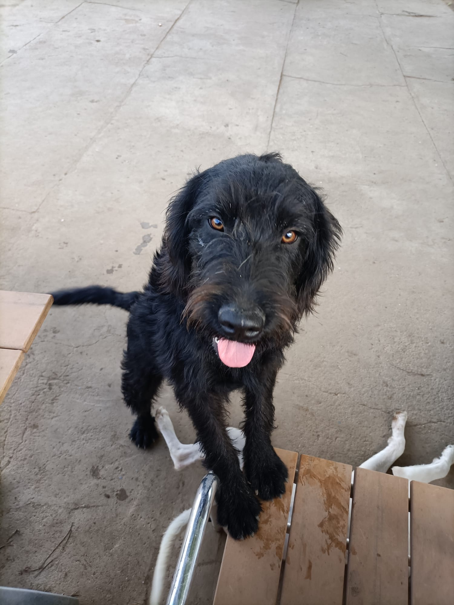 Unser kleines Kohlestückchen Orson marschierte im August 2022 auf eine Finca in der Nähe von Huelva und fragte dort bestechend höflich nach Essen, Wasser und Zuneigung. Zu dieser Zeit war der lustige Lockenkopf gerade 8 Wochen alt und die Besitzer der Finca waren sicher, dass bald jemand nach Orson fragen würde. Aber niemand kam, keine Mutter, keine verzweifelten Halter, keine Geschwister – und so informierten die Tierfreunde unsere Partner von Dolmen Animal.
