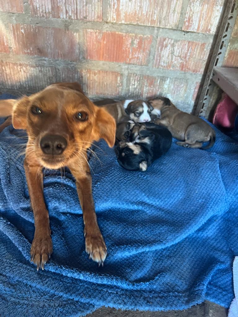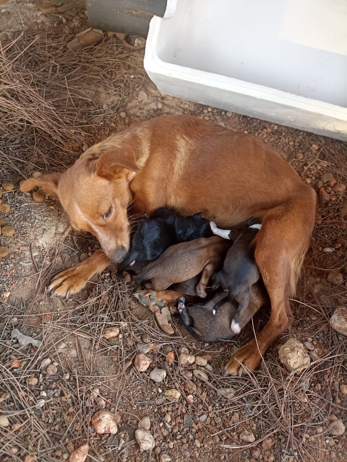Penelope tauchte eines Tages auf einer Finca irgendwo im Nirgendwo auf. Der Besitzer sah direkt, dass sein Besuch hochträchtig war und verständigte die Tierretter von Dolmen. Allerdings hatte Penelope sich zum Werfen versteckt und konnte nicht gefunden werden. Als sie mit ihren Babys nach der Geburt wieder auftauchte, sammelte man die kleine Familie sofort ein und brachte sie in die Geborgenheit der Tierpension.