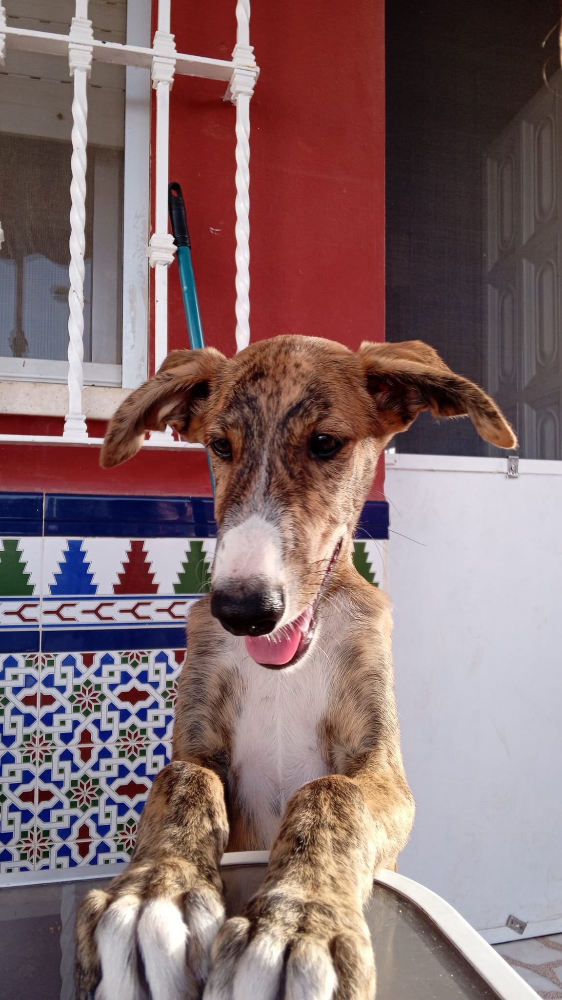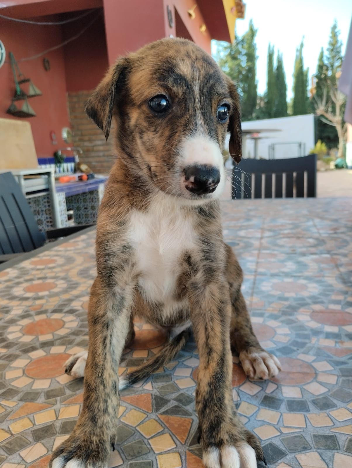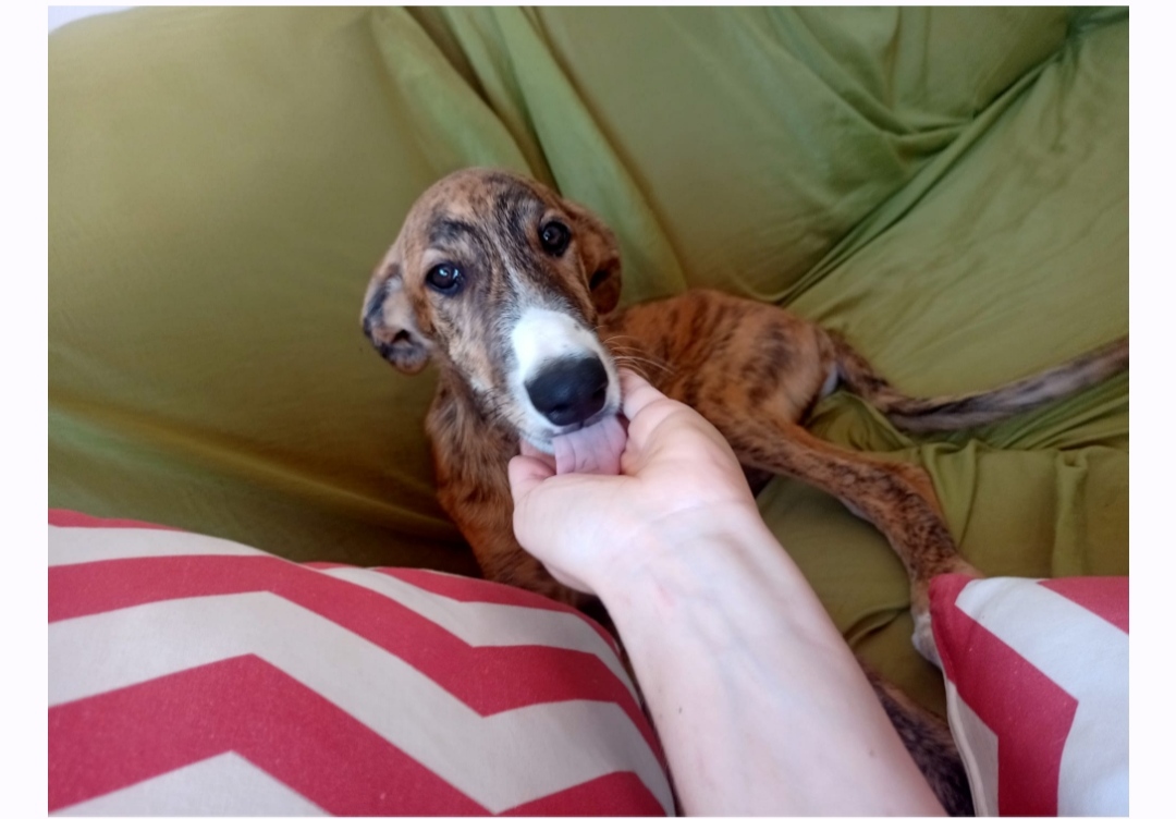 Greta ist ein Podenco-Mix und die Farbe ihrer Welpen lässt viele Vermutungen zu, was sich in den Genpool der Kleinen geschummelt haben könnte, aber im Moment tippen die meisten Tierschützer vor Ort auf einen Galgo, der sich siebenfach und mehr als eindrucksvoll verewigt hat. Wir haben also mit den bildhübschen Babys auf jeden Fall künftige Superathleten in der Vermittlung, die Menschen suchen, die gern draußen sind, die Ausdauersport betreiben, einen großen Garten haben und gestählte Wurfarme für langes, ausdauerndes Spiel mit dem Ball. Allerdings weisen wir auch darauf hin, dass Podencos gern im Winter zu Katzen mutieren – 22 Stunden am Tag dösend, meist mit den Beinen Richtung Decke, unwillig, sich bei Temperaturen unter 10°C mehr als 5m vom Ofen zu entfernen, oder wenn, dann nur ausgestattet mit dicken, warmen Mänteln, gerne in knallbunten Farben, um vor Freunden anzugeben.