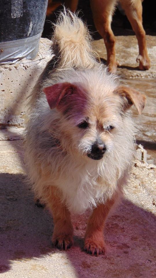Wenn man Senias Bilder betrachtet, sind Assoziationen mit Schäfchenwolken, Popcorn, Watte und Dauerwellen unvermeidbar, und geben Sie es ruhig zu, Sie wollen diesen witzigen Mix aus Lockenhund und Yorkshire-Terrier genauso gerne anfassen und und hemmungslos wuscheln wie ich.Senia wohnt seit März in der ArcoNatura und hat schon vor ihrem Einzug ins Tierheim unsere Partner gut auf Trab gehalten. Die kleine, ca. fünfeinhalb Jahre alte Hündin ist lebenserfahren und flink, und wenn Senia es auch immer aufs Beste verstand, sich Leckerchen zu erbetteln, hat sie es ebenso erfolgreich vermieden, sich anfassen oder sogar einfangen zu lassen. Da die ruhige und inzwischen auch sehr verschmuste Hundedame aber am Bahnhof lebte, wo die Hundefänger allgegenwärtig sind, man von Tierhassern Tritte kassiert und die Gefahr durch Züge und Busse natürlich extrem ist, musste eine Lösung her. Nun, unsere Freunde in Linares sind nicht dafür bekannt, einen Hund aufzugeben, also begab sich ein Tierschützer spät in der Nacht auf die Suche nahe der Gleise. Geduldig, mit Keksen bewaffnet und mit der unendlichen Tierliebe ausgerüstet, mit der unsere Freunde in Andalusien von Natur aus (oder von ArcoNatura aus?) versehen sind, schloss er in kleinsten Schritten Freundschaft mit Senia, und es endete genau so, wie sich das alle wünschten. Senia wanderte mit ihrem Retter nach Hause, verbrachte die erste Nacht in einem Haus und zog dann nach einem medizinischen Check, der ihr beste Gesundheit bestätigte, ins Tierheim um. Dort hat Senia jeden Tag mehr begriffen, dass die Tage, in denen sie die Menschen fürchten musste, endgültig vorüber sind.
