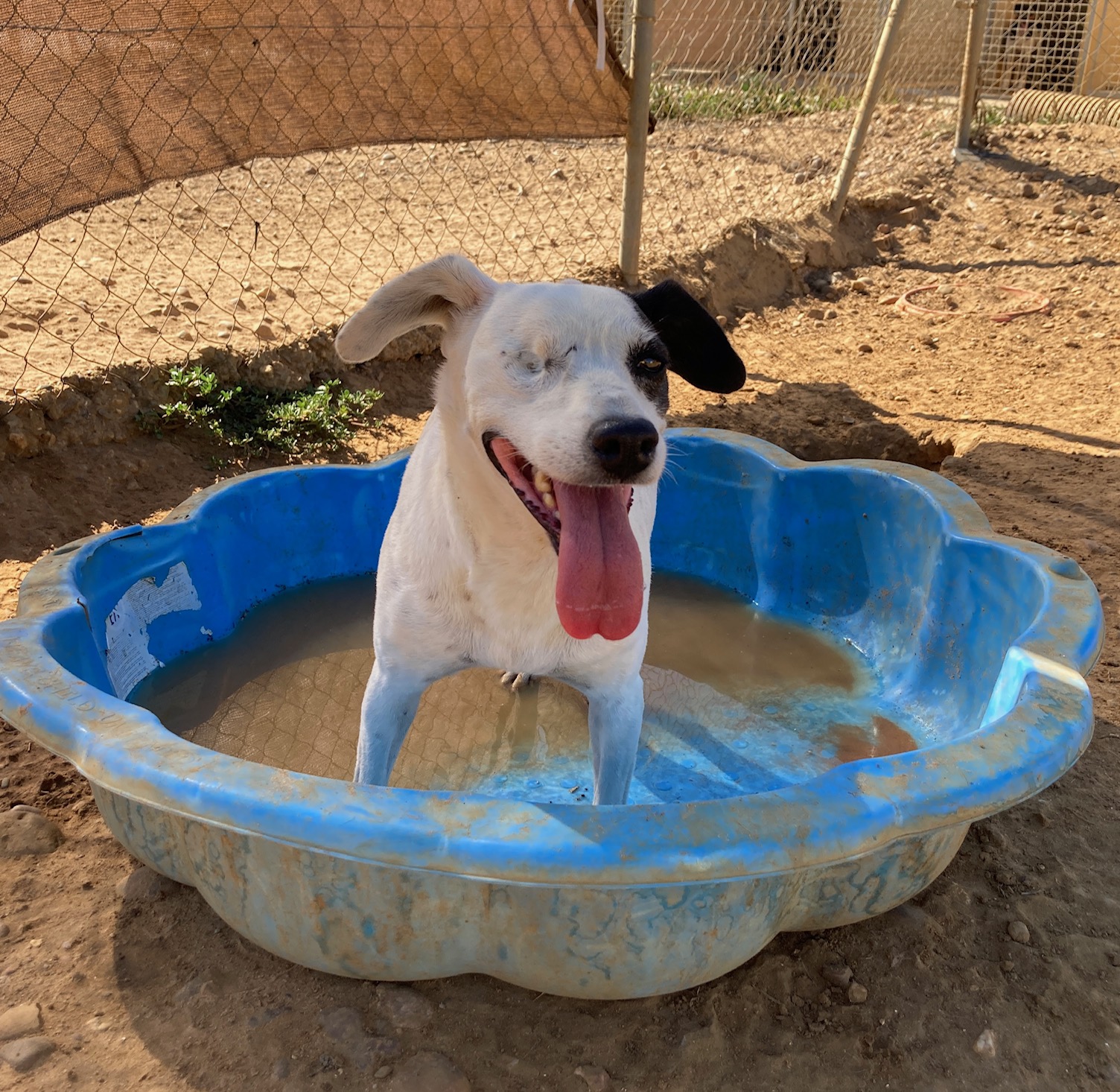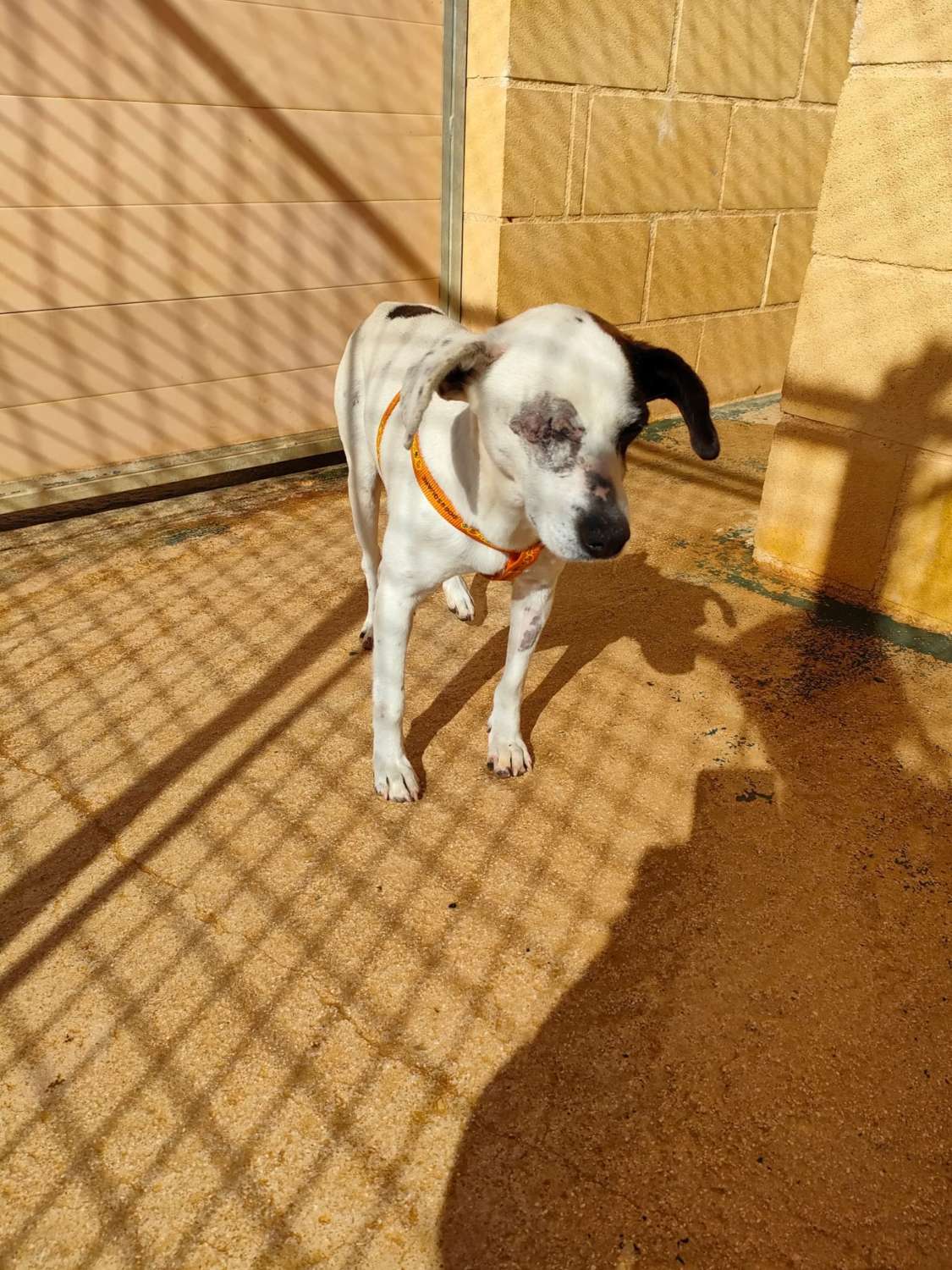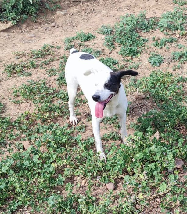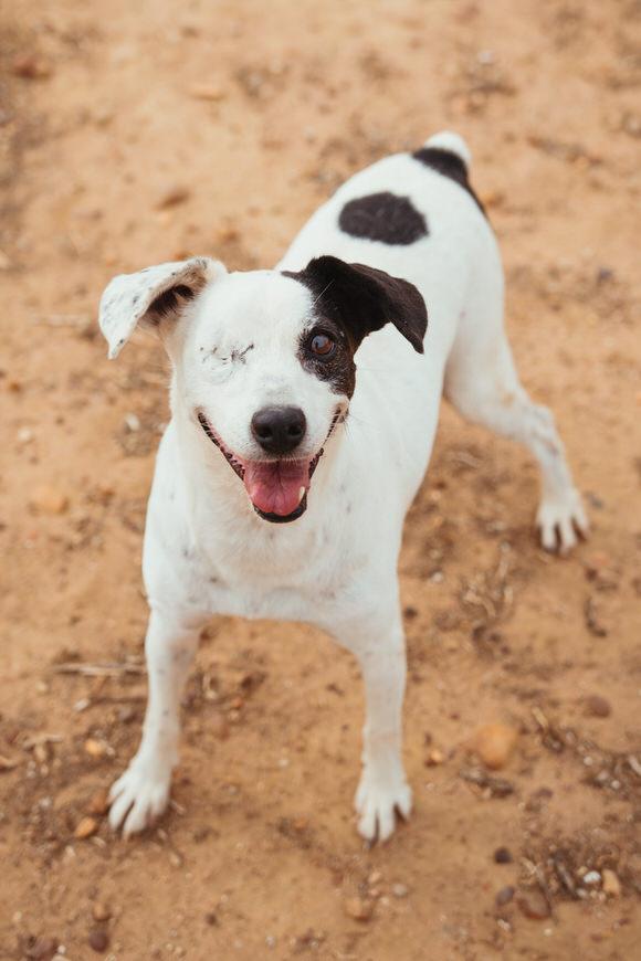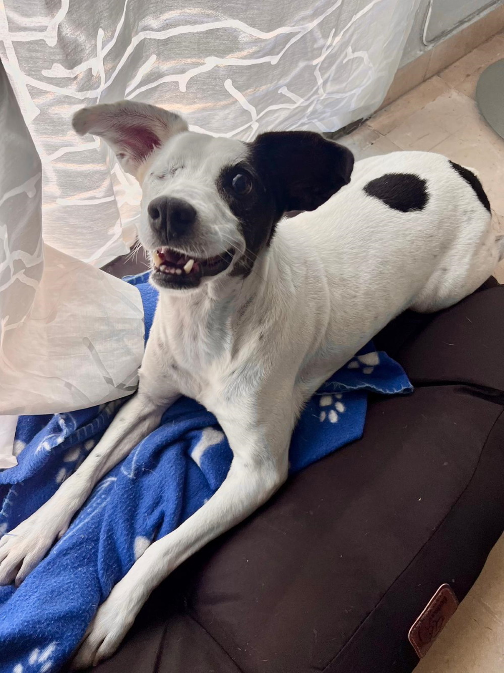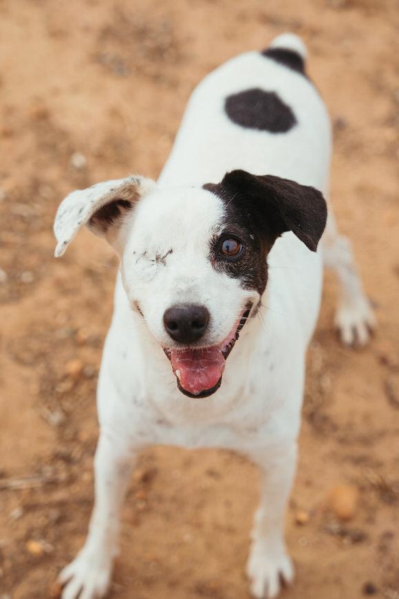 Sparrow kam vor vier Monaten in die Obhut unserer Freunde in Sevilla. Obwohl es natürlich vorkommt, dass Hunde in einem schrecklichen Zustand ins Tierheim kommen, ist es immer wieder ein Horror, so ein hilfloses Wesen in einen Kampf mit ungewissem Ende begleiten zu müssen. Sparrow war von Parasiten übersäte, vermutlich lag er lange einfach nur auf der Seite neben einer Straße, denn seine Hinterbeine waren partiell gelähmt und das Aufstehen und Laufen war kaum noch möglich. Ein Auge war so schwer verletzt, dass die Tierärzte es aufgrund der fortschreitenden Infektion direkt entfernen musste. Ein Tier in so einem erbärmlichen Allgemeinzustand operieren zu müssen, ist immer eine Herausforderung – und viele wachen nicht mehr auf. Aber Sparrow ist ein unglaublicher Kämpfer, und wer jetzt ins Tierheim der Arca Sevilla kommt und unserem lustigen Kuhflecken-Charmeur begegnet, würde niemals vermuten, welche Geschichte der Pirat zu erzählen hat.