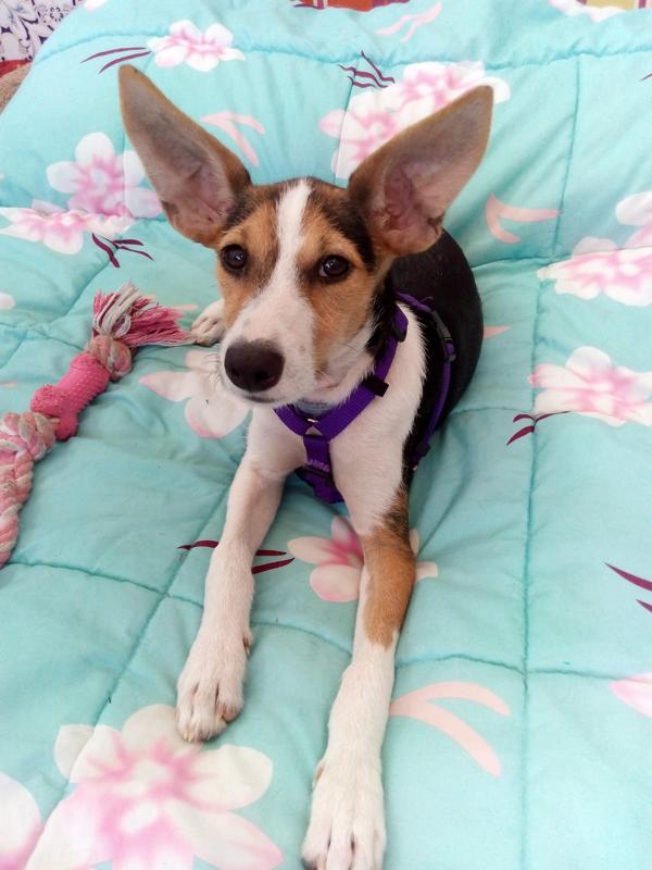 Gut, sprechen wir es gleich an, ohne groß um den heißen Brei zu reden: Tara ist ein Ohrentier! Bisher haben wir immer behauptet, dass unsere Podencos die einzig wahren Ohrentiere seien, aber Tara braucht sich nun mal ganz und gar nicht hinter unseren Fledermausohren zu verstecken, ich gebe also zu, Tara verdient den Titel uneingeschränkt. Vielleicht wächst unser Neuzugang, der nicht nur die Ohrentier-Maßstäbe neu definiert, sondern auch gleich noch die Cuteness-Tabelle sprengt, aber ja auch noch in ihre Lauscher – wer kann das schon wissen, ist Tara doch erst zarte vier Monate alt (Stand 09/2018).Ein junges Mädchen beobachtete das niedliche Hundebaby tagelang in einem Vorort von Linares. Tara war sehr scheu und flüchtete immer vor der helfenden Hand und so war viel Geduld gefragt, bis das schüchterne Bündel Leben irgendwann genug Vertrauen hatte, um sich ihrer Freundin (und Retterin) zu nähern. Über Kekse und erste Streicheleinheiten wurde ein zartes Band der Zuneigung gewoben und nach einiger Zeit gelang es der jungen Tierschützerin, ihr Findelkind mit heim zu nehmen. Da Tara dort nicht bleiben konnte, bat ihre Retterin auf Facebook um Hilfe. Unsere Partner von der ArcoNatura reagierten sofort, und eine höchst erfahrene Pflegefamilie bot an, das Tricolor-Mädchen in ihre Gruppe Hunde zu integrieren, bis Tara Fans gefunden hätte, die ihr ein Zuhause schenken wollten.Also wohnt Tara jetzt mit drei anderen Pflegehunden bei superlieben Leuten in Linares und wartet, ob irgendwann das Telefon klingelt und die Tierschützer ihr das Ticket ins Glück aushändigen. Bis dahin lernt die kleine Prinzessin schon das kleine Einmaleins des Familienhunds. Tara spielt mit Hingabe, hat inzwischen volles Vertrauen zu ihren Pflegeeltern und überrascht immer wieder mit lustigen Einfällen, wie man seine Menschen unterhält.Tara ist ein geniales Unikum, das wirklich jedes Herz im Sturm erobert. Sicherlich können Sie diesem Blick auch nicht widerstehen. Wenn Sie also ein Körbchen frei haben, viel Zeit und Geduld für ein Hundekind obendrein, dann melden Sie sich doch mal, und vielleicht stürmt Tara schon bald in Ihr Leben.
