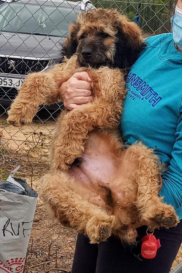 Wenn ich die Bilder unserer Schützlinge aus Spanien zum ersten Mal sehe, teilt mein Gehirn sie direkt in verschiedene Kategorien ein. Da gibt es:- Oh, was ist das denn?- Cuteness Overload- Lockenkopf- Ohrentier- Sanfter Riese, und noch einiges andere mehr. Bei unserem Neuzugang Yeti war eine klare Zuordnung aber in keiner Weise möglich, denn er erfüllt in jeder Hinsicht die Kriterien für ein echtes Ohrentier, aber er hat auch bezaubernde Locken, mit seinen Kulleraugen und seinem nackten Welpenbäuchlein könnte er gar nicht mehr Cuteness Overload sein – nur den Riesen, den schafft der lustige, erst vier Monate alte (Stand 11/2020) tatsächlich nicht. Yeti wurde auf einem Supermarkt-Parkplatz ausgesetzt. Der kleine Mann stand durchnässt und frierend angebunden an den Eiskaufswagen-Tunnel. Natürlich dachten die meisten Passanten, dass sein Besitzer sicher gleich wiederkommen würde, und erst nach Stunden fiel auf, dass der zitternde Hund immer noch an der gleichen Stelle ausharren musste. So rief man also die Tierschützer der Arca Sevilla zu Hilfe, die Yeti in ihre Obhut nahmen. Der niedliche Bub wurde in Handtücher gewickelt und erstmal warm gekuschelt – eine Aufgabe, die die ehrenamtlichen Helfer sicher gern übernommen haben. Trocken und satt offenbarte Yeti dann auch sein sonniges Wesen. Der witzige junge Mann fing direkt an zu spielen und fand im Tierheim ohne Umwege auch vierbeinige Freunde (auch wenn er nur mit wenigen Tieren Kontakt haben darf, da er aufgrund seines Alters noch anfällig für verschiedene Krankheiten ist, gegen die er noch keinen ausreichenden Impfschutz hat). Yeti ist ein entzückender Hundebub, der sich nichts mehr wünscht, als den kalten Winter nicht im Tierheim in einem Zwinger verbringen zu müssen. Vielleicht kann er ja Weihnachten schon mit seiner neuen Familie feiern?